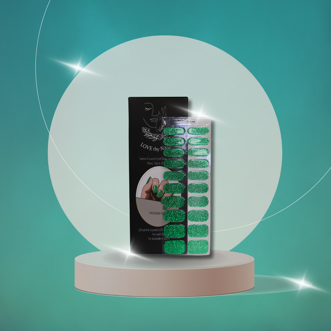 Capture the glittery essence with 'Green Green Grass' semi-cured nails, blending vibrant green with a sprinkle of glitter, perfect for celebrating any season in style.